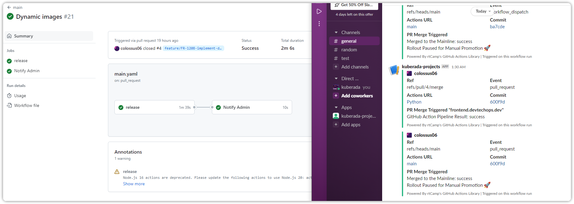 Once we merge the application, the pr-close.yaml and main.yaml pipelines trigger. pr-close.yaml deletes the development cluster and notifies admin that the pr is merged. On the other hand, since we push some new code to the main line, main.yaml also triggers and promotes the new version to production.