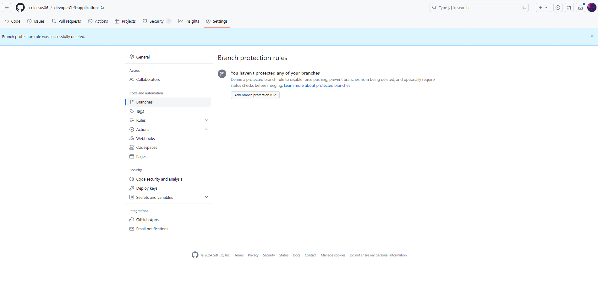 Simple branch protection rules have been implemented on the main branch. A branch protection rule can be set in Settings > Branches > Add Rule. One such rule is “Require a pull request before merging,” meaning that direct pushes to the main branch are not allowed.