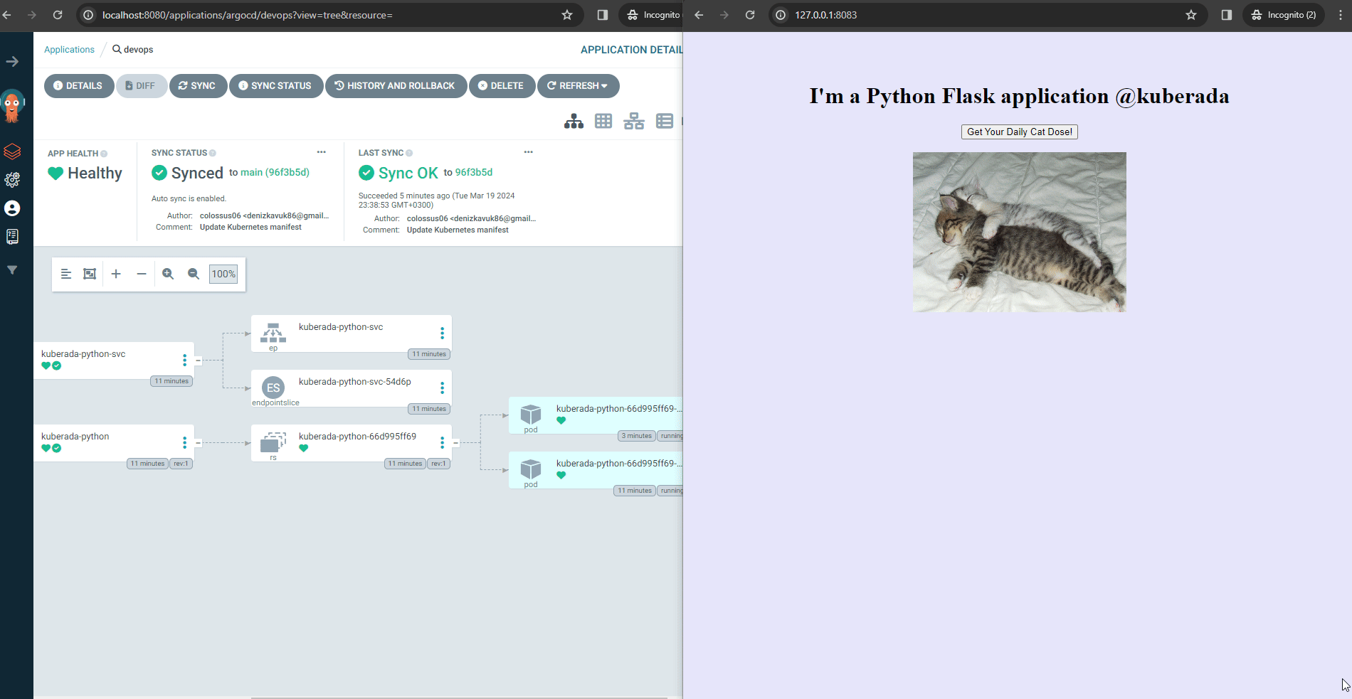 For a better user experience, the Python developer implements a new feature to display cat images dynamically and opens a pull request. As a DevOps engineer, our part is to design an automated and secure pull request pipeline (actually, we will create three pipelines: one for open/updated, one for closed pull requests, and the last one will trigger automatically when we merge to main) and bump up the new version successfully, adopting GitOps principles.