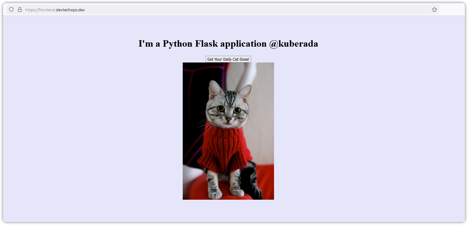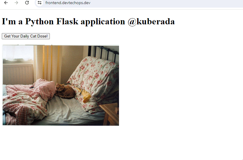We have a basic Python Flask application on a Kubernetes cluster (AKS). Users come to our application to get their daily cat dose. While analyzing user feedback gathered in user testing, we discovered that eight out of ten users found static cat images boring and said they would prefer dynamic images or GIFs. As a result, the product owner created a Jira ticket, and a Python developer on the team was assigned to implement the feature of displaying cat images dynamically.