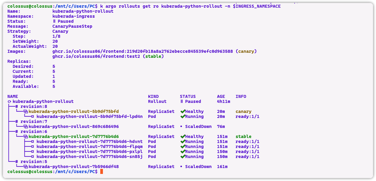 Finally, the traffic increases gradually until no pod is left from the earlier version of the application, which means that the weight reaches 100% and the rollout is completed successfully.