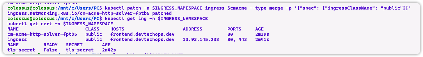 We have deployed a production and test cluster on AKS using Terraform for the prod cluster, deployed and installed Argo CD, argo rollouts, Nginx Ingress, and Cert Manager to encrypt the traffic to our application (Adding an A record for frontend.devtechops.dev pointing to Azure Load Balancer).